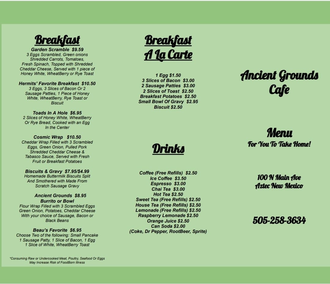 Welcome to Ancient Grounds Cafe, a delightful dining spot nestled at 100 N Main Ave, Aztec, NM. This charming cafe combines great food with a warm atmosphere, making it a favorite among locals and visitors alike. Whether you're in the mood for a hearty breakfast or a satisfying lunch, Ancient Grounds Cafe is your go-to destination for pleasantly delicious meals made with quality ingredients.